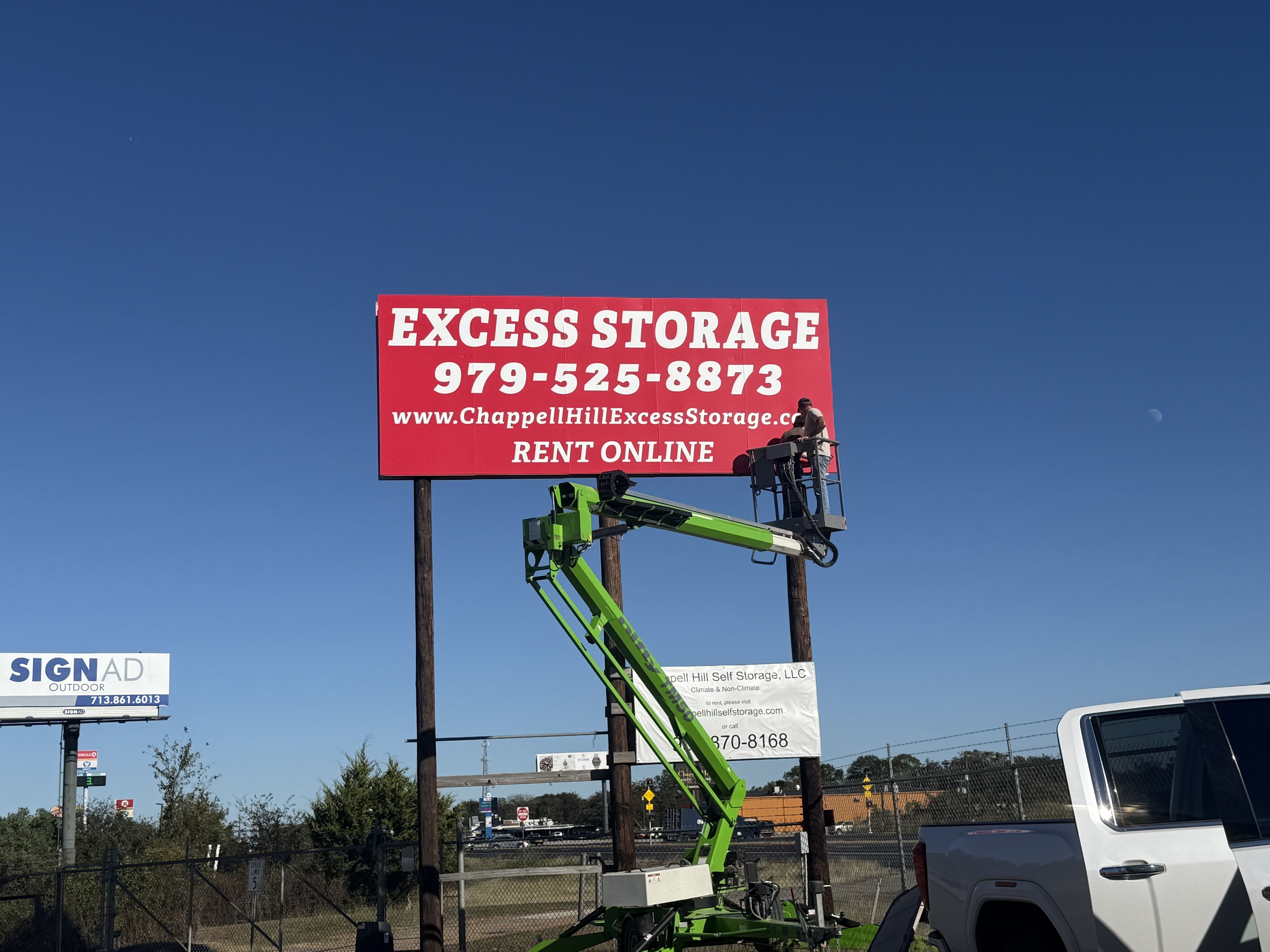 Excess Storage is growing, but we are committed to continuing to provide the same great personal customer service. We are still 100% family owned and operated. Shout out to these two for facing their fears of heights to hang the new sign at our newest location in Chappell Hill. Call or rent online today. 979-525-8873 www.ChappellHillExcessStorage.com